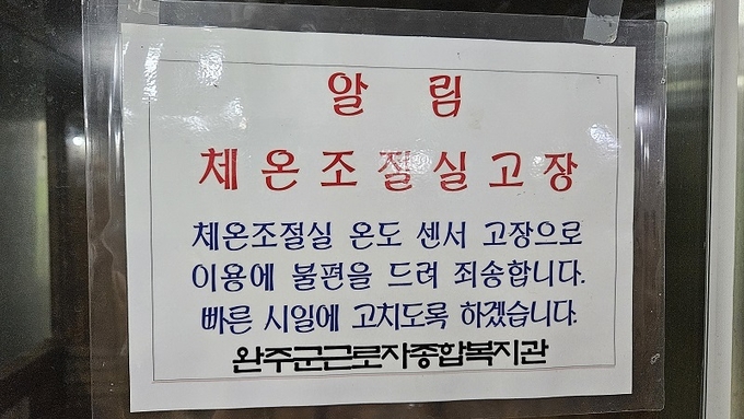 한편, 이곳 외 완주군 내 3개 수영장 체온조절실은 정상 운영 중이고, 고장이 나면 휴일에 수리해 이용자들의 불편을 최소화하고 있다는 게 완주군의 설명이다.