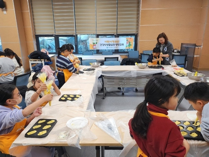 프로그램은 어린이 눈높이에 맞춘 겨울철 영양교육 이론과 설탕과 지방을 줄인 재료를 활용해 건강한 마들렌을 직접 만들어보는 체험활동으로 구성됐다.