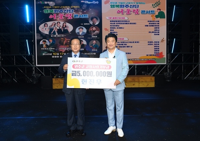 [완주신문]완주군 명예군민인 트로트 가수 현진우 씨가 ‘행복완주산단 어울림 콘서트’에서 고향사랑기부금 500만원을 기탁했다.