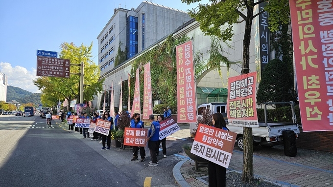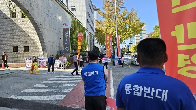 [완주신문]완주전주통합반대책위원회가 전주시청 입구에서 “통합반대”를 외쳤다.
