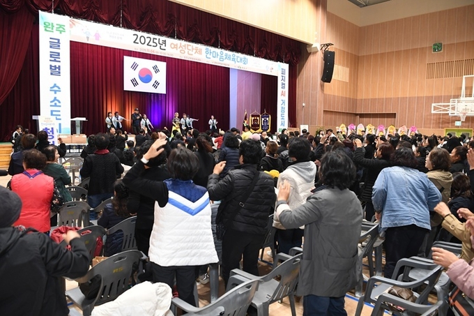 [완주신문]완주군여성단체협의회(회장 채미화)가 4일 완주군문화체육센터에서 ‘2025 완주군 여성단체 한마음 체육대회를 열었다.