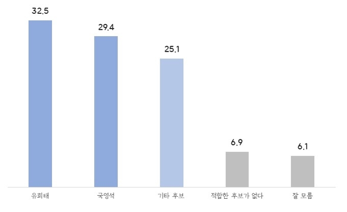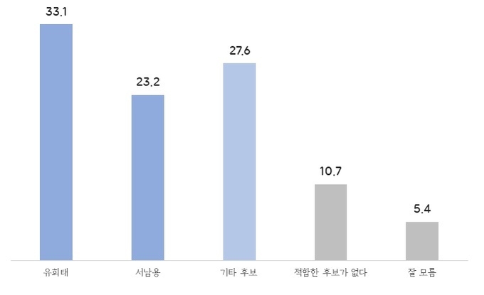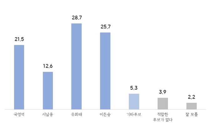 아울러 단일화와 결선 등 상황을 감안해 유력후보 간 양자대결도 조사했다. 결과는 유희태 32.5%·국영석 29.4%, 유희태 33.1%·서남용23.7%, 유희태 33.2%·이돈승 31.3%다.