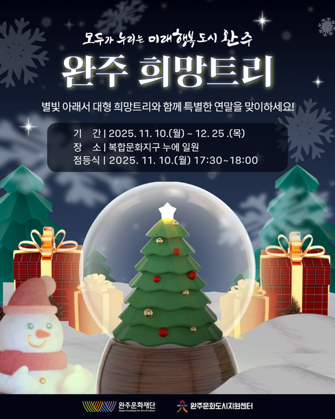 이번 대형 희망 트리는 오는 10일부터 12월 25일까지 46일간 점등되며, 연말연시 동안 완주군민과 방문객들에게 따뜻한 휴식과 포토존의 즐거움을 선사할 예정이다.