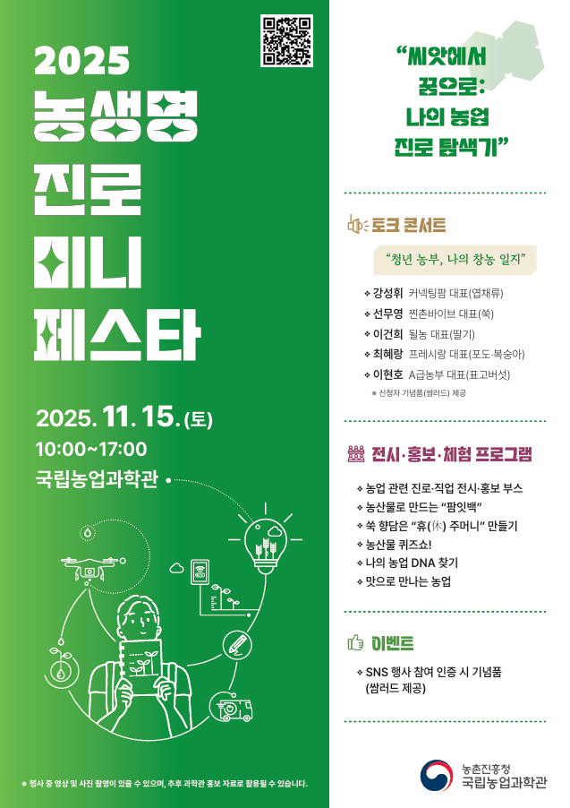 [완주신문]농촌진흥청(청장 이승돈)은 청소년들에게 농업의 가치와 다양성 체험 기회를 제공하고, 진로 탐색의 장을 마련하기 위해 오는 15일 농업과학관에서 ‘2025년 농생명 진로 미니 페스타’를 개최한다.