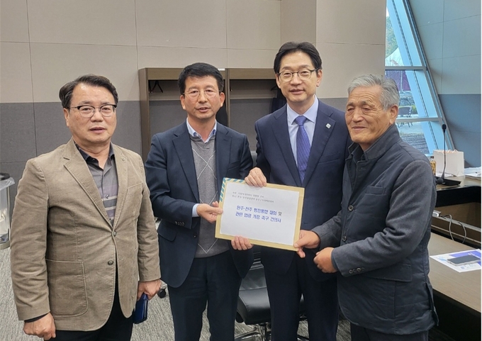 [완주신문]완주전주통합반대완주군민대책위원회 송병주 상임대표와 전북특별자치도의회 권요안 의원, 이돈승 자문위원이 지난 20일 지방시대위원회 김경수 위원장에게 ‘완주·전주 행정통합 철회 및 관련 법령 개정 촉구 건의문’을 공식 전달했다.
