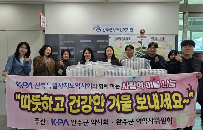 또한 완주군여약사회와 완주군약사회는 겨울철 취약계층을 위한 따뜻한 나눔에 동참하며 이불 50채, 총 400만원 상당의 물품을 후원했다. 해당 이불 50채는 독거 노인 등 취약한 장애인 가정 50가구에 전달될 예정이다.