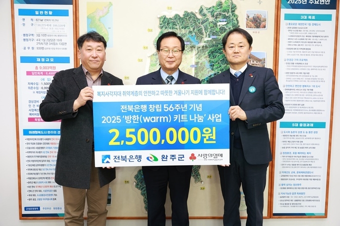 [완주신문]전북은행(은행장 백종일)이 연말을 맞이해 완주군청에 취약계층을 위한 ‘2025 방한(Warm) 키트’ 60상자(250만원 상당)를 전달했다고 18일 밝혔다.