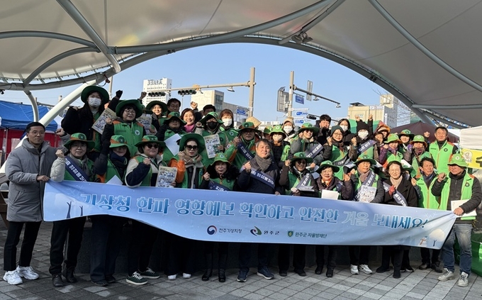 완주군 지역자율방재단이 13일 삼례시장에서 전주기상지청과 협업해 겨울철 대설‧한파 예방 캠페인을 실시하며 군민과 야외근로자 등 겨울철 취약계층을 대상으로 재난 예방 홍보 활동을 펼쳤다.