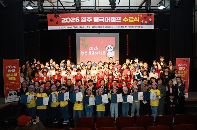 이번 수료식은 초등학교 2학년부터 중학교 1학년까지 학생 43명이 참여한 중국어캠프의 교육 성과를 공유하는 자리로, 유희태 완주군수와 유의식 군의회 의장, 재단 이사, 학부모 등 100여명이 참석해 학생들의 성장을 함께 축하했다.