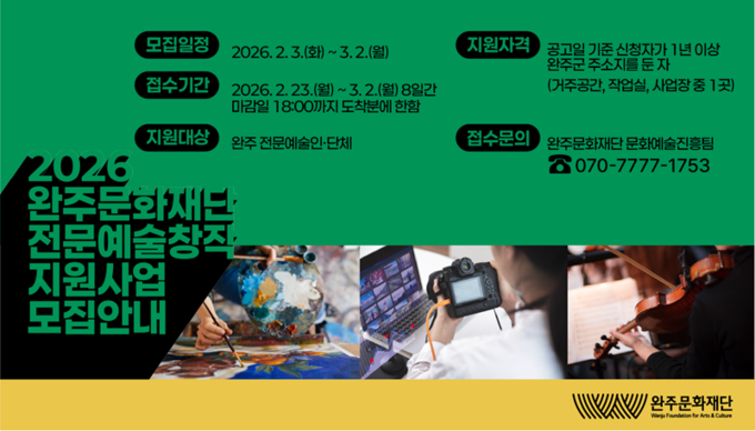 완주문화재단(이사장 유희태)은 2026년 한 해 동안 지역 예술인의 안정적인 창작활동을 지원하기 위해 2026 전문예술창작지원사업에 참여할 예술인 및 예술단체를 모집한다.
