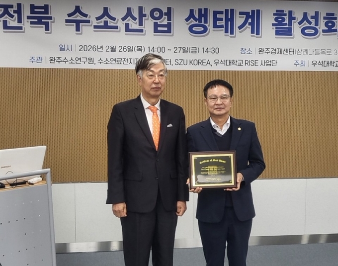 시상식은 완주경제센터에서 열린 ‘전북 수소산업 생태계 활성화 워크숍’ 현장에서 진행됐다. 김 부의장은 완주군의 수소 특화 국가산업단지 유치 추진과 수소 산업 관련 조례 제정, 거버넌스 체계 구축 등에 앞장서며 지역 수소 생태계 기반을 다진 공로를 높이 평가받았다.