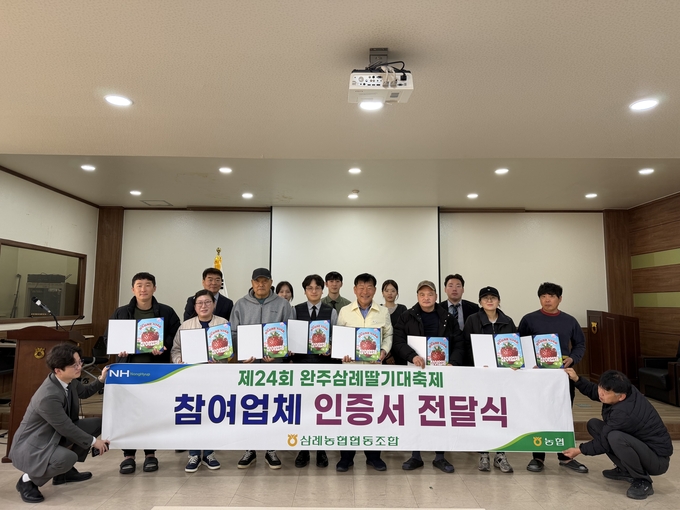 삼례농협(조합장 강신학)은 24일 ‘제24회 완주삼례딸기대축제 참여업체 인증서 전달식’을 개최하고, 축제 기간 다양한 분야에서 활약한 참여업체들의 노고를 격려했다.