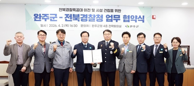 완주군과 전북경찰청은 2일 완주군청 전략회의실에서 경찰특공대 이전 및 청사 신축을 위한 업무협약(MOU)을 체결하고 전북 경찰특공대 이전 사업을 본격적으로 추진하기로 했다.